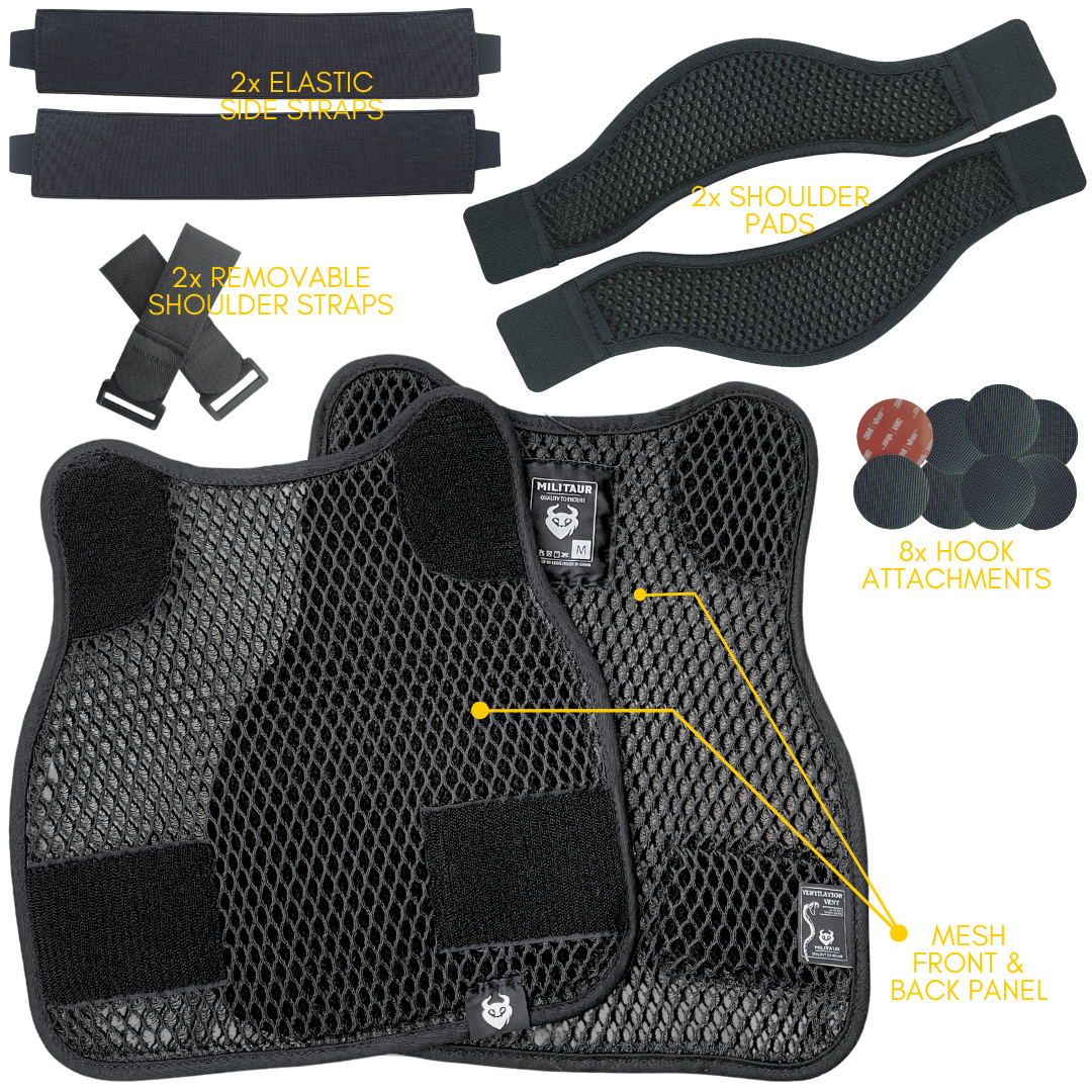 *Each Vest comes with Front and Back Vest Panels, 2 Adjustable Shoulder Straps, 2 Adjustable Side Straps, 2 Removable Velcro Straps to Ensure your Ventilation Vest Remains in Place and 8 ventilation hook attachments.